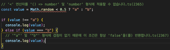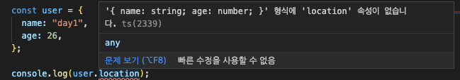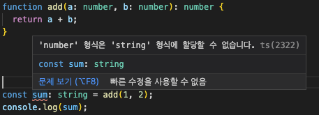 하지만, 타입스크립트에서는 시스템 규칙에 따라 에러라고 표기해야 하는 부분이 있다면, 에러를 보여줍니다.